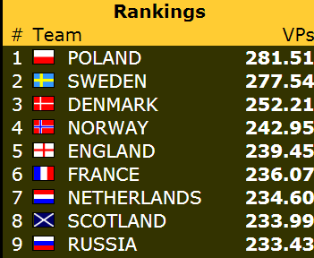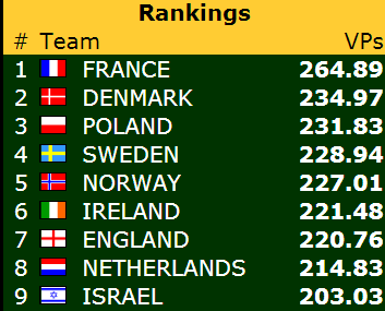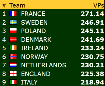 Norge var oppe på tredjeplass i en tidlig fase av kampen, men i skrivende stund har de 15 VP opp til pallen. Avstanden ned til niendeplassen ser (foreløpig) betryggende ut. Den er i skrivende stund på drøyt 12 poeng.