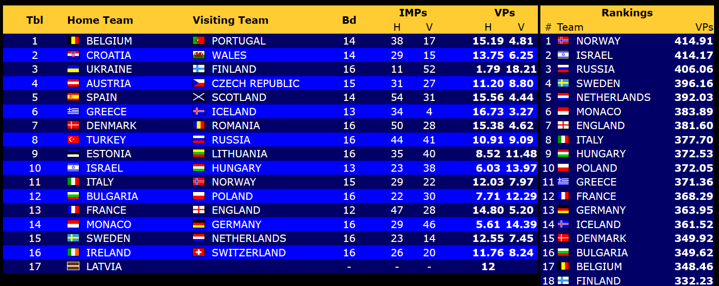 I realiten ble ikke spill 16 spilt samtidig i de to kampene, og dermed visste vi jo allerede Norges resultat på spillet idet Israel og Ungarn tok fatt på mesterskapets siste spill. Heldigvis fikk Norge altså 8 IMP inn på siste spill. Buttspill i Israels kamp hadde akkurat holdt for Norges del, men det gjorde ingenting at Ungarn fikk en syver inn.