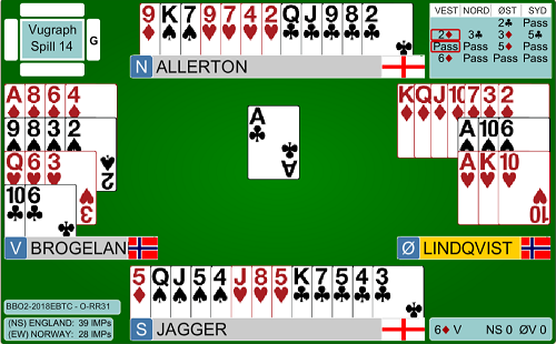Boye fikk kjøpe kontrakten i 2 kløver ved det andre bordet (2 kløver fra Espen viste begge major, men med dårlig tilpasning i major og grei 6-korts kløver var det beste Boye kunne gjøre å passe ut).