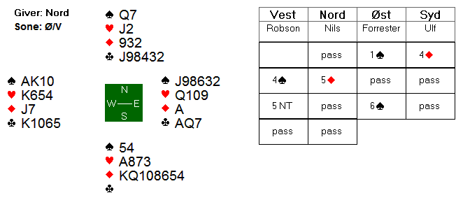 Ved det andre bordet gikk det pass rundt på 4 spar etter samme innledning. Nord ser at 5 ruter sannsynligvis er en god stamp, men samtidig gir det motparten mer rom til å finne en eventuell slem.