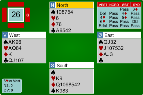 Nord hadde forklart til øst at redoblingen på 4 hjerter viste 1. kontroll, og øst mente han hadde doblet 6 kløver dersom han visste at hjerter ess ga stikk.