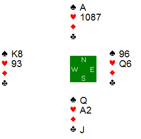 Nord spilte ut hjerter ess, og skiftet til spar ess og ny spar. Spillefører stjal en hjerter og fortsatte i spar, som syd kunne stjele.