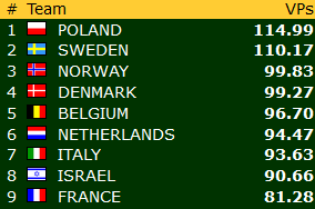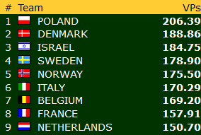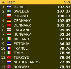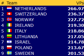 Dermed ligger Norge på tredjeplass før siste runde, og har mer enn 15 VP ned til Italia på fjerdeplass. Med andre ord et meget godt utgangspunkt som vi håper de tar vare på!