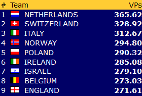Norge - Nederland 10,61 - 9,39 (IMP-score: 29 - 27)