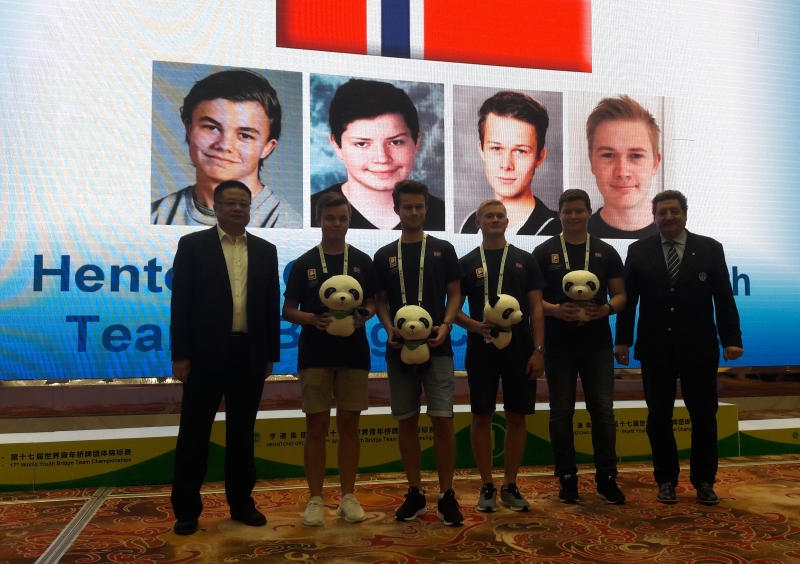 I kveld var det premieseremoni i Wujiang. Det var Sverige som fikk mest heder for sine to gull, i henholdsvis U21- og U26-klassen. Men det var også norske representanter på scenen. U21-laget skulle nemlig motta applaus for sin seier i B-finalen i Board-a-match-turneringa. Det ble ingen medaljer denne gang, men hver av spillerne fikk en pandabamse som et minne om innsatsen I BAM og turen til Kina. Det var godt med en opptur på tampen av oppholdet for U21-laget.