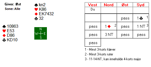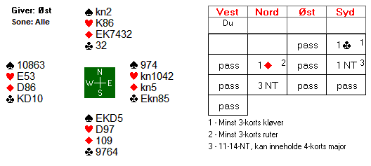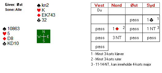Årsaken til at vi avblokkerte kløver 10 i første stikk var at vi skulle være sikker på æ være inne hos blindemann etter det tredje kløverstikket. Hadde vi hatt 109 igjen i kløver på hånda, kunne syd tvunget oss til å være inne på hånda etter den tredje kløverrunden.