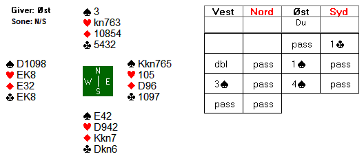 Kløveråpninga fra syd viste minst trekortsfarge, og utspillet mot 4 spar var kløver dame. Hvordan ville du ha lagt opp spilleføringa?