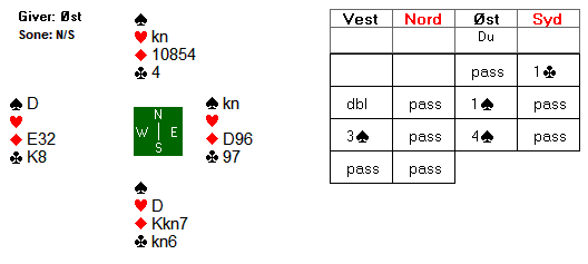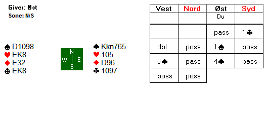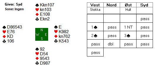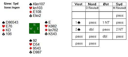 Bror Mikael i syd hadde lite å bidra med i motspill mot 2 spar, og tok ut i 2 grand, som trolig viste to steder å spille. Med trippelt sparhold og uten noen firekortsfarge, valgte Ola å passe ned 2 grand. Østs hadde til å doble, og det ble siste ord i meldingsforløpet.