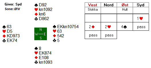 Til slutt valgte han å ta finessen, og med den aktuelle sitsen ga det 12 IMP til svenskene. Kanskje ikke helt urimelig i og med at nord er markert med maksimalt fire poeng i hjerter, ruter og kløver. Ville han støttet til 2 hjerter med så lite som 4 hp i form av to knekter og ei dame?