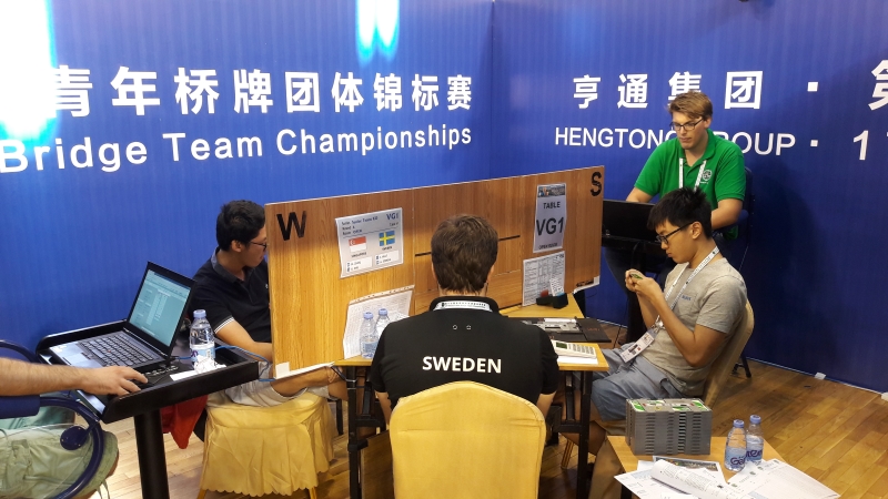 Før de to siste spillene ledet Sverige med åtte IMP. Nest siste spill gikk ut. Siste spill bød på litt spenning da spilleren fra Singapore som satt i øst valgte ei litt utradisjonell grandåpning. Han fikk kjøpe kontrakten, selv om nord-syd hadde ni stikk i majorkontrakt. Takket være langfargestikk i minorfargene var det mange stikk i grand øst-vest, og det hele endte med ni stikk og 150 til øst-vest.