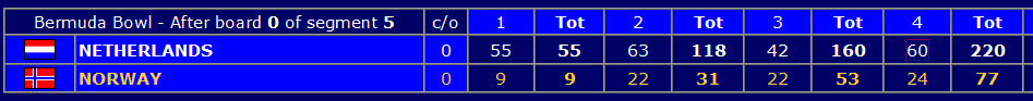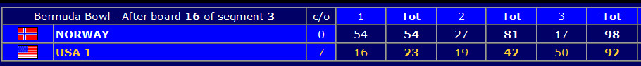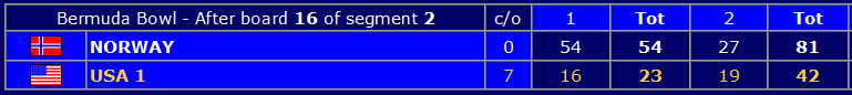 Merk at Norge vant settet med 38 IMP, men fikk 7 IMP i straff på grunn av sein spilling ved Espen og Boyes bord. Dermed er altså ledelsen justert fra 54-16 til 54-23.