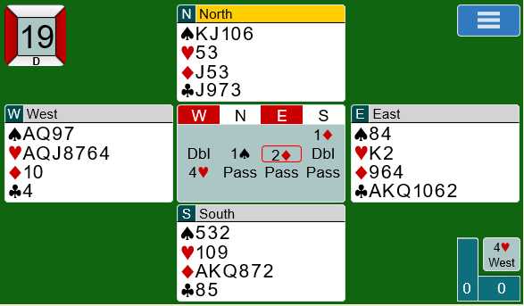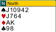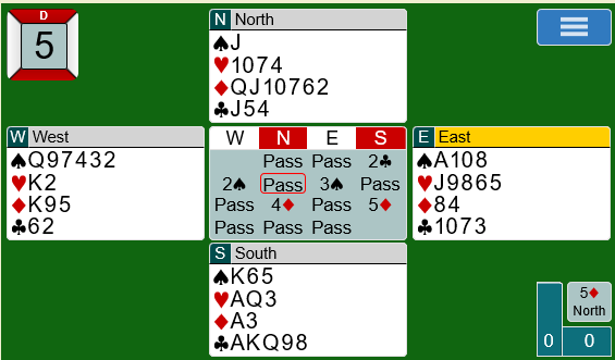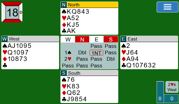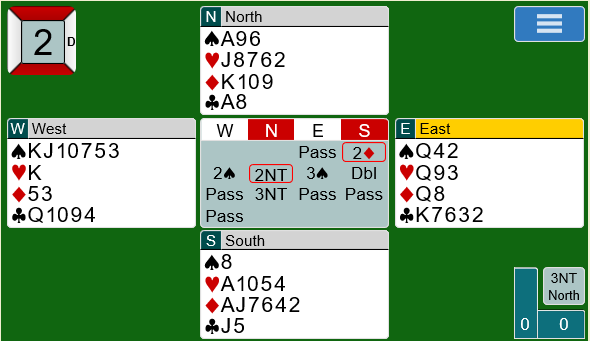 2 ruter fra nord viste trefargehånd med kortfarge i ruter og normal åpningsstyrke. Det ble buttspill etter at også amerikaneren vant 4 hjerter.