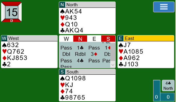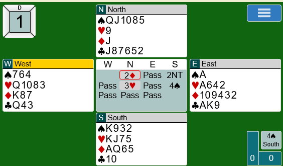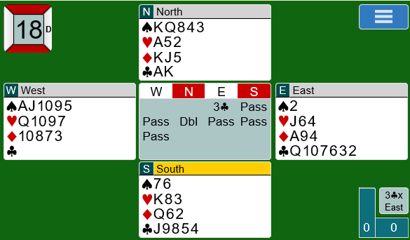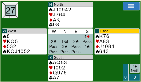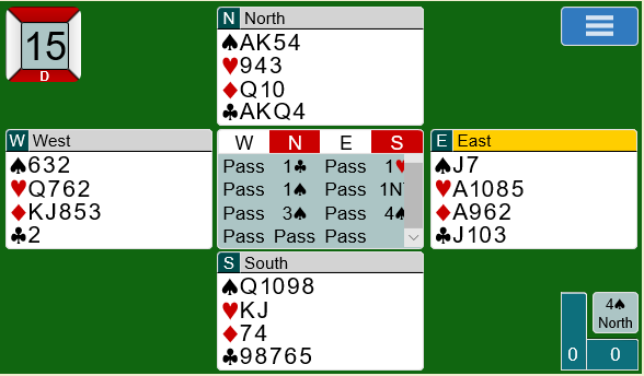 Som du ser står det 4 spar når trumffinessen går.Kløver ut vinnes med esset. Deretter må man spille ruter til esset og ta trumffinessen. Man må innkassere ruter konge før trumfen er ute fordi man trenger å kaste kløvertaperen på ruter dame før motparten kommer inn. Alt motspillerne kan få tak i er tre hjerterstikk.