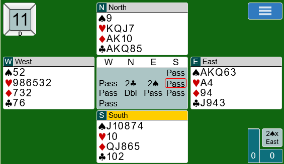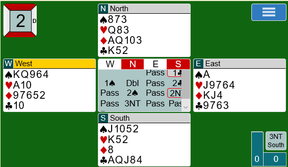 Ved det andre bordet åpnet Espen med 2 spar, 8-11 poeng og 6-kortsfarge:
