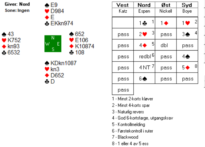 Dermed hadde de brent en sjanserik slem, som i verste fall står på sparfinessen. Denne gang satt spar ess riktig, og det var ingen fare for å tråkke feil.