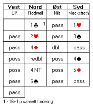 Det skal sies at meldingsforløpet gikk noe annerledes ved det andre bordet. Rodwell gikk inn med 4 hjerter direkte over 1 ruter. Dermed har han ikke samme informasjonen som Ulf, og det blir betimelig å trekke ut trumfen, for så å teste om kløveren løser seg. Hvis ikke kløveren brekker, kan man falle tilbake på finessen i spar.