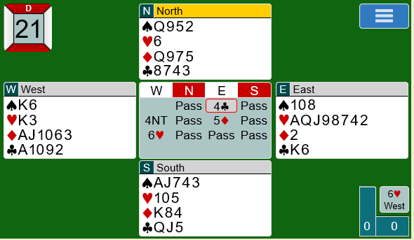 Det var ikke enkelt å spille ut hjerter etter at nord hadde vist hjerterfarge, og øst hadde ønsket et sterkt ønske om ruter ut. Det ble da også spilt ut ruter ved begge bord. Kontrakten gikk hjem etter at trumfen ble trukket ut og kløver dame stukket over. Kløveren ga nok stikk så lenge ikke en av motstanderne hadde utstyrt seg med tieren fjerde i kløver. Buttspill.