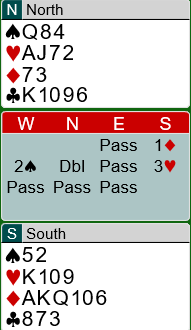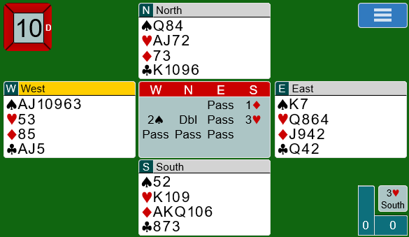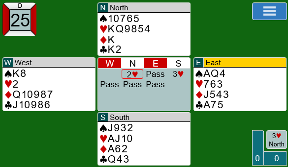 Hva lover i så fall innmeldinga 3 hjerter? Er den mest å anse som utspillsdirrigerende, eller tyder den på ambisjoner om å spille kontrakt egen vei? Kanskje begge deler?