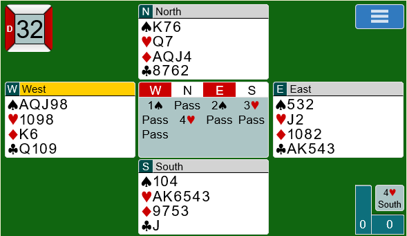 Med honnør dobbel i vest må man spille en mellomhonnør fra bordet. Dekker vest, stikker man med esset og spiller ny hjerter mot bordet. Om det kommer liten på fra øst, har man valget mellom å finessen eller å prøve å toppe ut nieren.