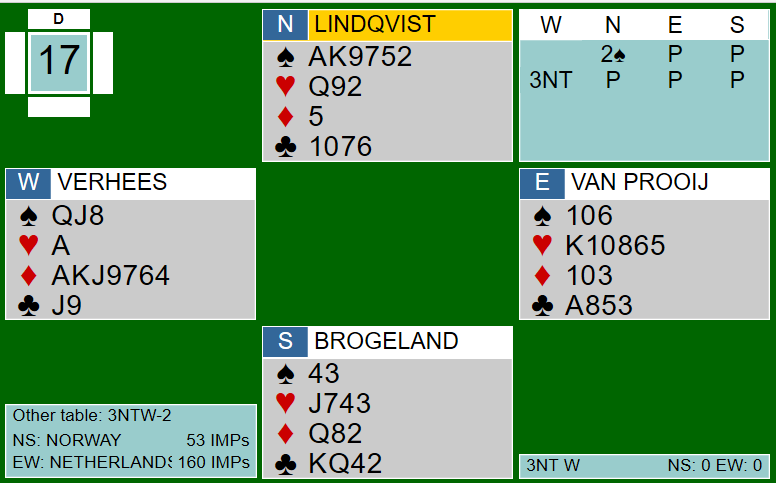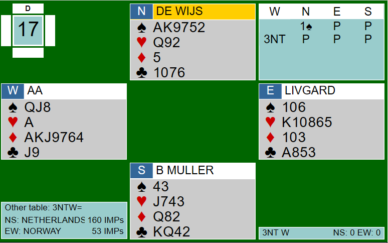 Nederlenderne meldte, naturlig nok, utgang ved det andre bordet etter at syd åpnet med en 15-17-grand. Også der spilte vest ut sin single ruter. Spillefører hadde ikke annet valg enn å legge liten om han skulle ha sjanse til å vinne kontrakten. Da kunne Allan spille ruter 2 til steling hos makker, og fikk dermed samtidig fortalt at han hadde ønske om kløver tilbake. Terje spilte kløver 7 til esset fulgt av nok ei ruterstjeling. Terje måtte også få for kløver konge og spar ess. Tre beit og 7 IMP inn til Norge.