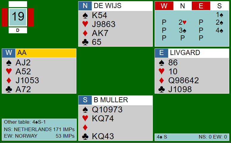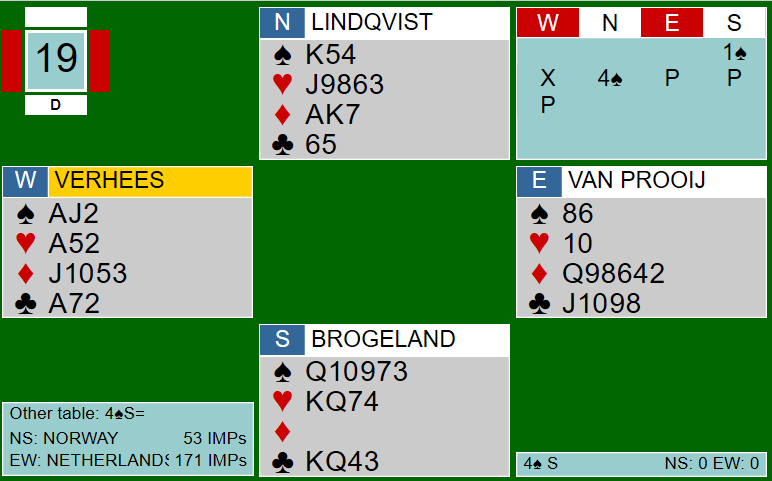 Ved det andre bordet vrengte nederlenderen trumffinessen. Ruter til essert ble fulgt av spar til dama og esset. Ny ruter trumfet spillefører på hånda, og seilte ruter 10. Da den sto og øst fulgte farge var det bare å trekke ut den siste trumfen før hjerteren ble godspilt. Vunnet majorutgang var verdt 10 IMP for Nederland.