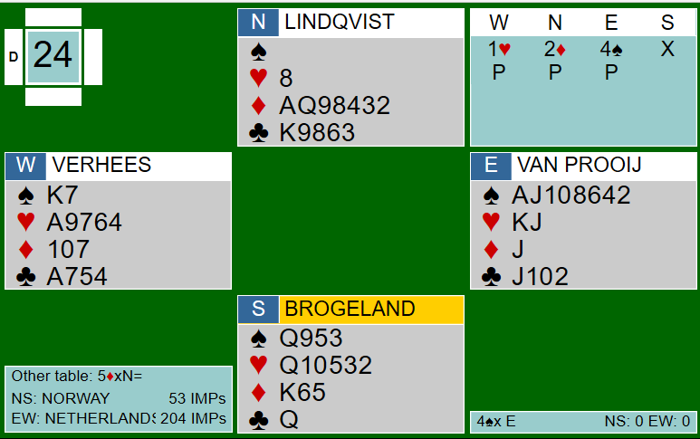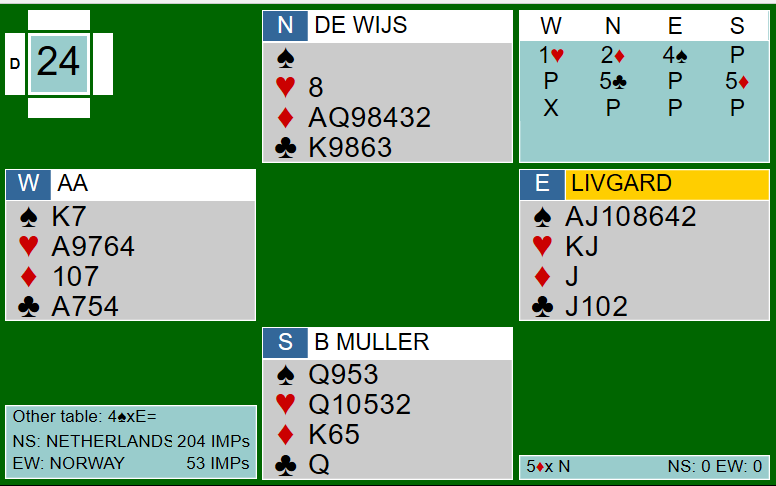 Innledninga var lik, men syd passet altså 4 spar. Nord var med en gang til med 5 kløver, og syd måtte preferer til 5 ruter. Terje doblet selvsagt sluttkontrakten. Selv med hjerter konge ut og skift til trumf, var det ikke mer enn to ess å få tak i for forsvaret. Den gunstige kløversitsen med knekt-ti tredje gjorde at spillefører bare trengte å stjele én kløver i bordet før den farga var godspilt. 550 ut i tillegg til 590 fra det andre bordet var verdt 15 IMP for nederlenderne.