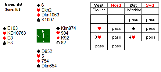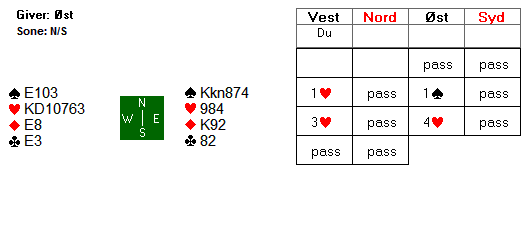 Det hele endte med to beit og 300 til Christian og Sofie. Denne scoren ga ikke mange poeng da en stor andel av parene hadde fått spille majorkontrakt i sonen øst-vest.