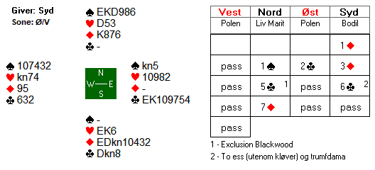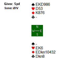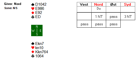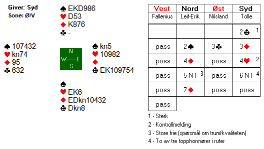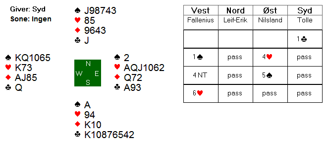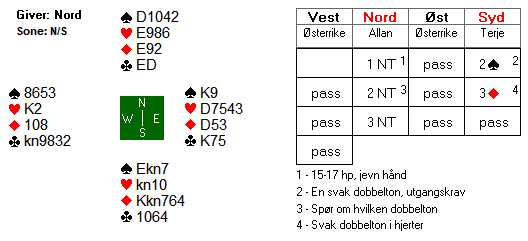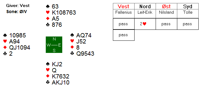 Etter 1 hjerter fra Espen, meldte syd inn 1 spar. Boye kunne meldt 2 kløver for å vise en god løft i hjerter, og fikk dermed vist omtrent 5-8 hp ved å melde 2 hjerter. Espen nøyde seg med en invitt, og da slo Boye naturlig nok av. I 3 hjerter var det to tapere i hver av de røde fargene. Dermed ni stikk.