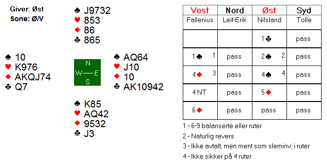 Franskmennene meldte seg opp i 3 grand på vests hånd. Nils hadde tidenes enkleste utspill, og innkasserte raskt fem kløverstikk og sikret beit i kontrakten før spillefører kunne kreve resten.