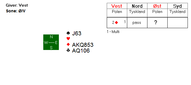 Etter 1 ruter (presisjon) fra Ulf i syd, gikk vest innpå med 1 grand. 2 kløver fra Nils viste begge major. Det er uvisst hva 2 spar fra øst viste, men etter alt å dømme var øst-vest på tur til 3 kløver. Ulf hadde imidlertid gode kort, og det var opplagt å være med siden han hadde tilpasning i hjerter. 3 hjerter var ikke mulig å vinne, og aktuelt ble det to beit. Dermed fem IMP til Frankrike.