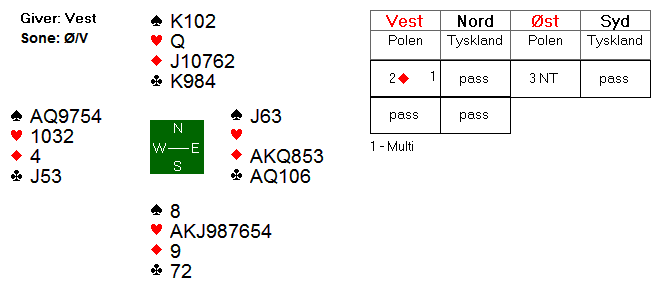Dessverre var det de samme stikkene i grand-kontrakt, og franskmennene fikk faktisk meldt denne utgangen etter at Bessis oppvurderte østs hånd til en 20-21-NT. Volcker i vest tok seg ikke bryet å søle etter 5-kortsfarge i major hos makker. Han tenkte nok at veien ofte kan være kortere til ni stikk i grand enn ti stikk i majorkontrakt når han har ei trillrund hånd: