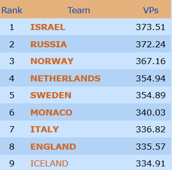 Spill 20 ga forøvrig utgangssving inn både for damene og veteranene også. Det var henholdsvis Marianne Harding og Peter Marstrander som spilte hjem kontrakten for våre to andre lag, mens deres respektive motstandere gikk beit. Dermed ble det altså 13 IMP til Norge i alle tre klasser på dette spillet. Akkurat slik vi liker det!