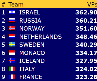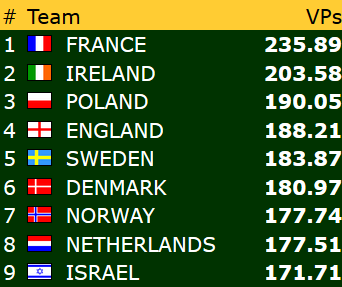 Etter ni stikk i 3 grand ble det 6 IMP til Frankrike.