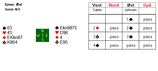 Ida Øberg i nord kunne telle to sparstikk, seks hjerterstikk, to ruterstikk og ett kløverstikk, altså elleve stikk totalt. Om makker hadde ruter dame ville det være stikk nummer tolv og dessuten var det gode sjanser for at ruteren kunne gi det trettende stikket også, enten med ruter knekt hos makker eller dersom farga sitter fint nok til at håndas fjerde ruter ville bli god. 1 ruter i åpning viste minst trekortsfarge, men det er kun med 4-4 i major og dobbel kløver at åpningshånda har kun trekorts ruter. Det er verdt å nevne at kløverfinessen er en tilleggsjanse dersom ruteren ikke ordner seg for fire stikk. Dessuten kan det være skvismuligheter.