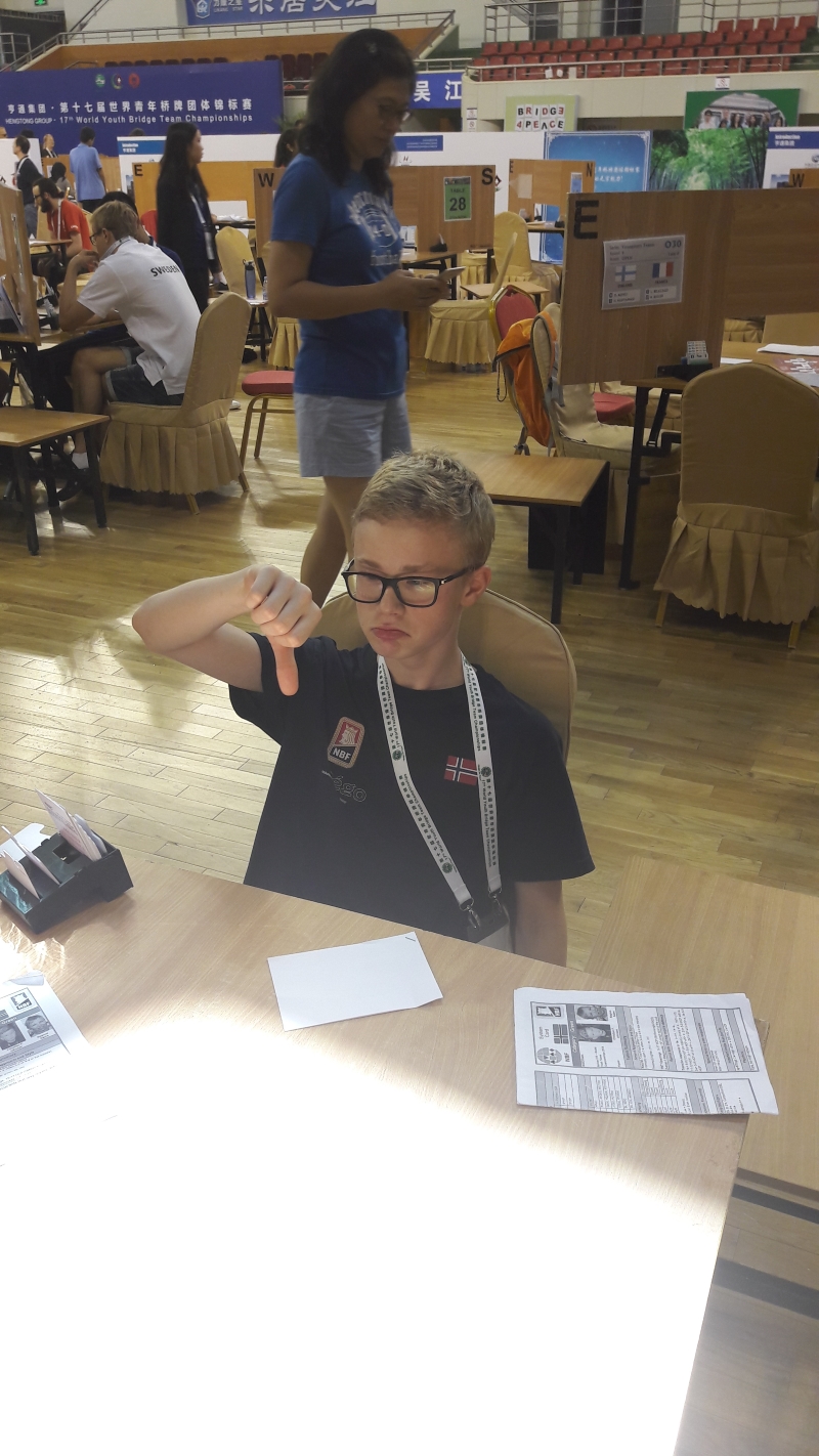 Det norske U16-laget gikk dessverre på et klart tap i VM-kvartfinalen mot Kina 3 mandag. Kampen gikk over 36 spill fordelt på tre sett, og kineserne vant til slutt 141-63 etter en kamp med mye omsetning. Norge tapte første sett med 34 IMP og andre sett med 46 IMP, og oppgaven før tredje sett var dermed nærmest umulig da man lå bak med 80 IMP. Også i siste sett var det mye omsetning, men i dette settet var det Norge som trakk det lengste strået og vant 52-50. Avansementet var likevel aldri truet for kineserne, og Norge går dermed glipp av muligheten til å møte Sverige i semifinalen. Det blir i stedet plasseringsspill og kamp om plassene fra fem til åtte for det norske laget på tirsdag.