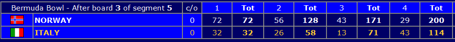 Dessverre fikk vi ikke se noen av de tre siste settene mellom Norge og Italia på BBO. Jeg kan tenke meg at det er mange der hjemme som gjerne hadde ønsket å se Boye, Espen og de andre norske i aksjon. Men det ble altså besluttet at denne kampen skulle være en av svært få kvartfinaler (alle fire klassene sett under ett) som ikke ble vist. Trolig var begrunnelsen at dette var en av kampene hvor avstanden var størst mellom lagene. Men det betydde vel ikke nødvendigvis at kamoen var avgjort, eller? Og uten forkleinelse for noen av de andre lagene vil jeg påstå at det er såpass stor interesse for oppgjøret mellom Norge og Italia at det absolutt burde vært overført på BBO, på tross av at avstanden mellom lagene var stor.