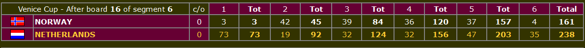 Det sjette og siste settet av kvartfinalene i VM starter tirsdag formiddag klokka 10:30 norsk tid. Heller ikke denne gang får vi se Norges lag i åpen klasse mot Italia på BBO. Dette er en av kampene hvor differansen er størst mellom de to lagene, nærmere bestemt 78 IMO og dermed har den blitt ofret fra sendeskjemaet siden det ikke er rom for å vise alle kampene på BBO. De norske spillerne er imidlertid fullt fokuserte, og ingen av de ser ut til å ha innkassert noen seier på forskudd.