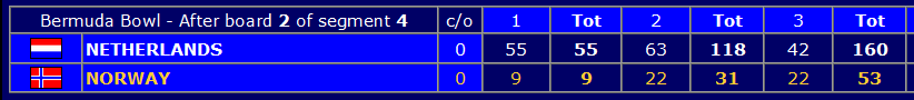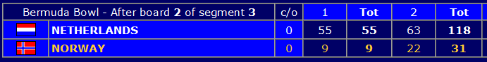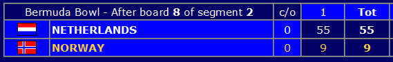 Damene tapte dessverre forrige sett med 10 IMP, og har en formidabel oppgave foran seg. De har 46 IMP å ta igjen på Nederland med 16 spill igjen å spille. Siste sett kan følges på BBO.