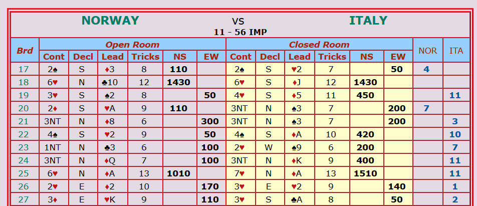 Dette meldingsforløpet er riktignok hentet fra damekampen mellom Norge og Nederland. Marianne og Ann Karin stoppet i lilleslem, mens nederlenderne meldte storeslem. 11 IMP ut for damene, og det samme ble det altså i åpen klasse da Allan (nord) og Terje stoppet i 6 hjerter, mens italienerne meldte 7 hjerter mot Boye og Espen.