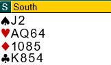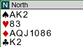 Det kan fort ende med at spillefører må løse trumfen uten taper i og med at det ser ut til å bli en taper i hver av de andre fargene. Det er ikke all verdens med inntak i nord. Normalt vil man spille liten mot ess-dame første gang. Når dama står, og nieren eller tieren faller bak, er det kanskje naturlig å tro at det enten er singleton eller 10-9 dobbel.