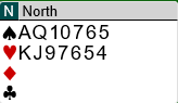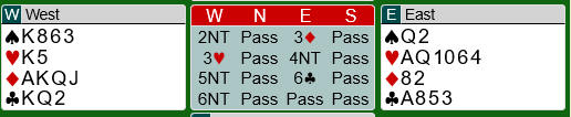 Jeg er usikker på hva alle meldingene betyr, men 2 grand viser 20-21 hp og 3 ruter er overføring til hjerter. Nå kan jeg tenke meg at 4 gran er kvantitativt (invitt til lilleslem). Trolig tar 5 grand imot og er på utkikk etter en eventuell 4-4-tilpasning i minor, mens 6 kløver viser 4-kortsfarge.