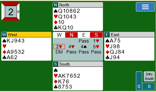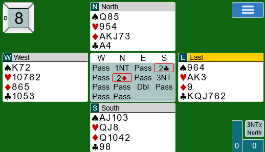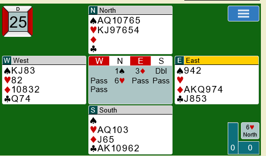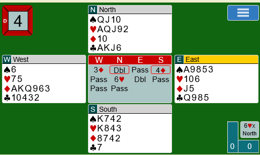 Her ser vi hva som er det store problemet ved å doble i praksis. Man må forvente at makker melder, og man har jo egentlig ikke tilpasning til hverken kløveren eller hjerteren. Dermed har man i praksis meldt 6 ruter på egen hånd om ikke makker mot formodning skulle klare å passe.