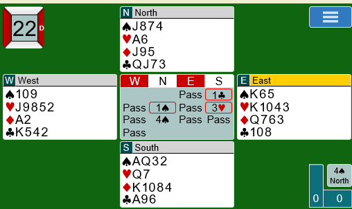 Han valgte å gå inn med 4 hjerter før øst avsluttet med 4 spar. Der ble det ti stikk etter at forsvaret fikk ett stikk i hver av majorfargene og ett ruterstikk.