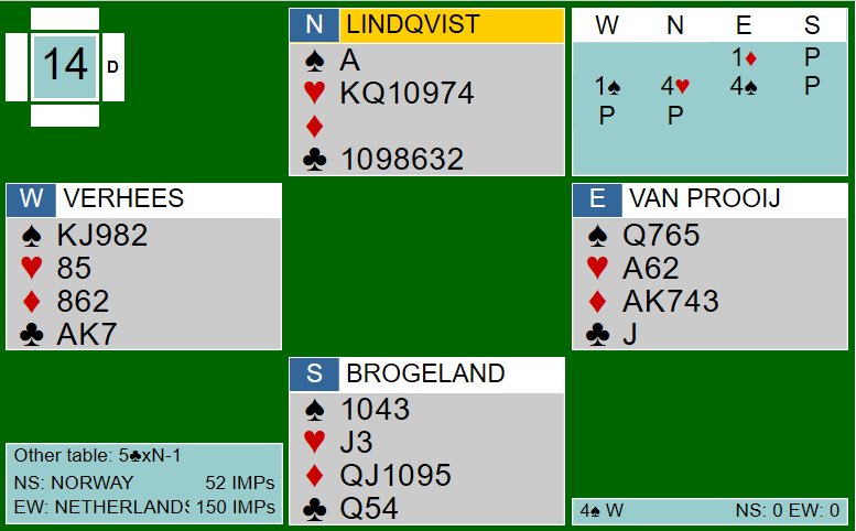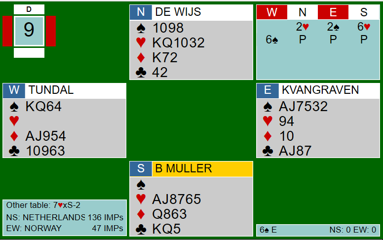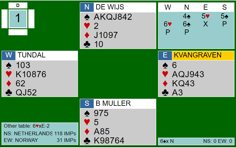 Liv Marit (nord) og Bodil meldte seg opp i 6 hjerter etter en renonsvisende splintermelding i nord. 5 hjerter viste så to av fem ess uten hjerterdama. Utspillet var spar dame, som gikk til stjeling i bordet. Bodil fortsatte med ruter til stjeling, kløver til knekten og ny ruter til stjeling. Da kongen kom på fra øst sto kontrakten nå bare på at hjerteren var jevnt fordelt. Hjerter konge og hjerter til esset ga gode nyheter, og nå var det bare å pumpe stående ruter fra bordet. Vunnet lilleslem og 11 IMP til Norge da Nederland stoppet i utgang ved det andre bordet.
