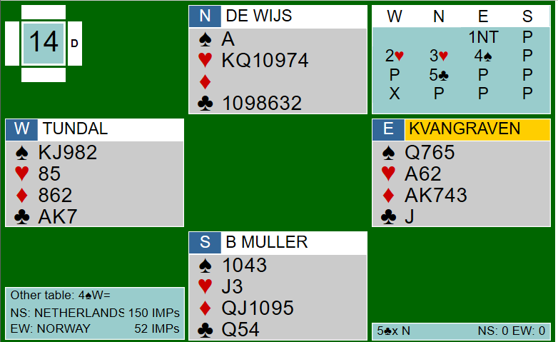 Boye passet faktisk i andrehånd med 12-poengeren i vest. Etter at Espen hoppet ut i 4 hjerter følte Boye at han hadde til å gå på en gang til. Denne gang hadde Espen strukket seg Med en sikker kløvertaper har man bare råd til én taper i trumf. Med aktuell sits lot ikke det seg gjøre. Dermed ble det beit i 5 hjerter. Nederland spilte 4 hjerter med ti stikk ved det andre bordet, og dermed kunne de notere 10 IMP til i sin kolonne.
