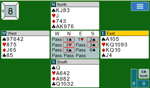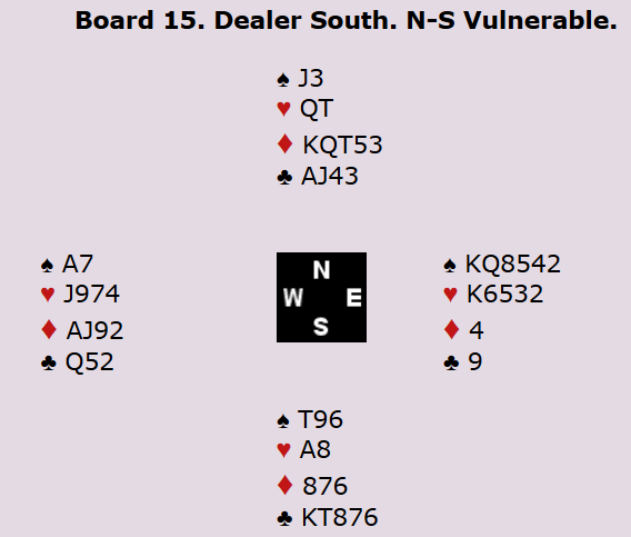 Det ble også problemer ved de bordene hvor syd meldte 3 spar. Nord hadde ingen opplagt melding, men hadde lyst til å melde en gang til. Noen steder ble det høynet til 4 spar, og der må det også bli beit siden syd har mange rutertapere å bli kvitt og kan bli tvunget til å stjele med store trumf i nord. Øst må fort få tre trumfstikk.