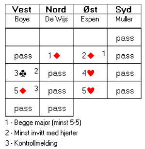 Espen valgte å åpne med søppelmulti, som normalt viser 0-7 honnørpoeng, med 8-poengeren i nord. Boye la seg på lur i busken med den enorme hjertertilpasninga. Han kunne riktignok ikke være 100 % sikker på at makker hadde hjerter etter 2 spar inn fra øst. Men da vest viste spartilpasning var det i alle fall ikke tvil om hvilken farge multiåpninga var basert på. Espens dobling regner jeg med viste god hjerterfarge. Boye tok det fortsatt rolig, men kom tilbake med en noe spektakulær 5 ruter over 4 spar fra øst. Kanskje var det for å prøve å få det til å se ut til at hjertertilpasninga ikke var riktig så formidabel. Om han fikk motparten til å tro på dette ville de kanskje bli mer fristet til å doble?