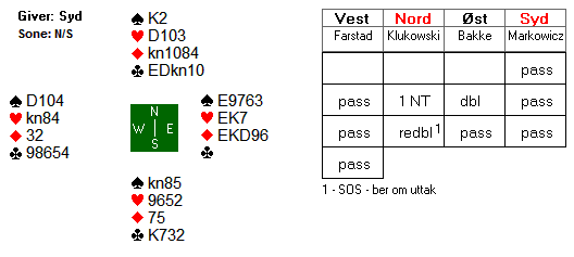 Jeg spilte ut en høy ruter. Etter utspillet kommenterte den polske spilleføreren at det var spesielt å passe redoblingen, så alle ble da klar over at kontrakten var redoblet før spillet fortsatte. Det Spørs av Arve hadde tatt sjansen på å passe i fjerde hånd om han hadde sette redoblingen, for man trenger jo ikke 20 gode honnørpoeng for å doble 1 grand.