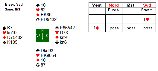 Derfor mener jeg hjerter er den mest trolige trumffarga. Makker får også sjansen til å løfte med de rette kortene, for eksempel Kxx, Dx, xxx, Exxxx. Om han har noe særlig dårligere kort enn dette bør han si pass på 3 hjerter.