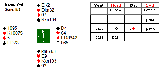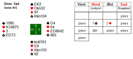 I og med at nord hoppa til 6 hjerter mener jeg det kan indikere at han ikke har ruterdame. Da kommer spørsmålet om en eventuell rutertaper an på fargelengden.